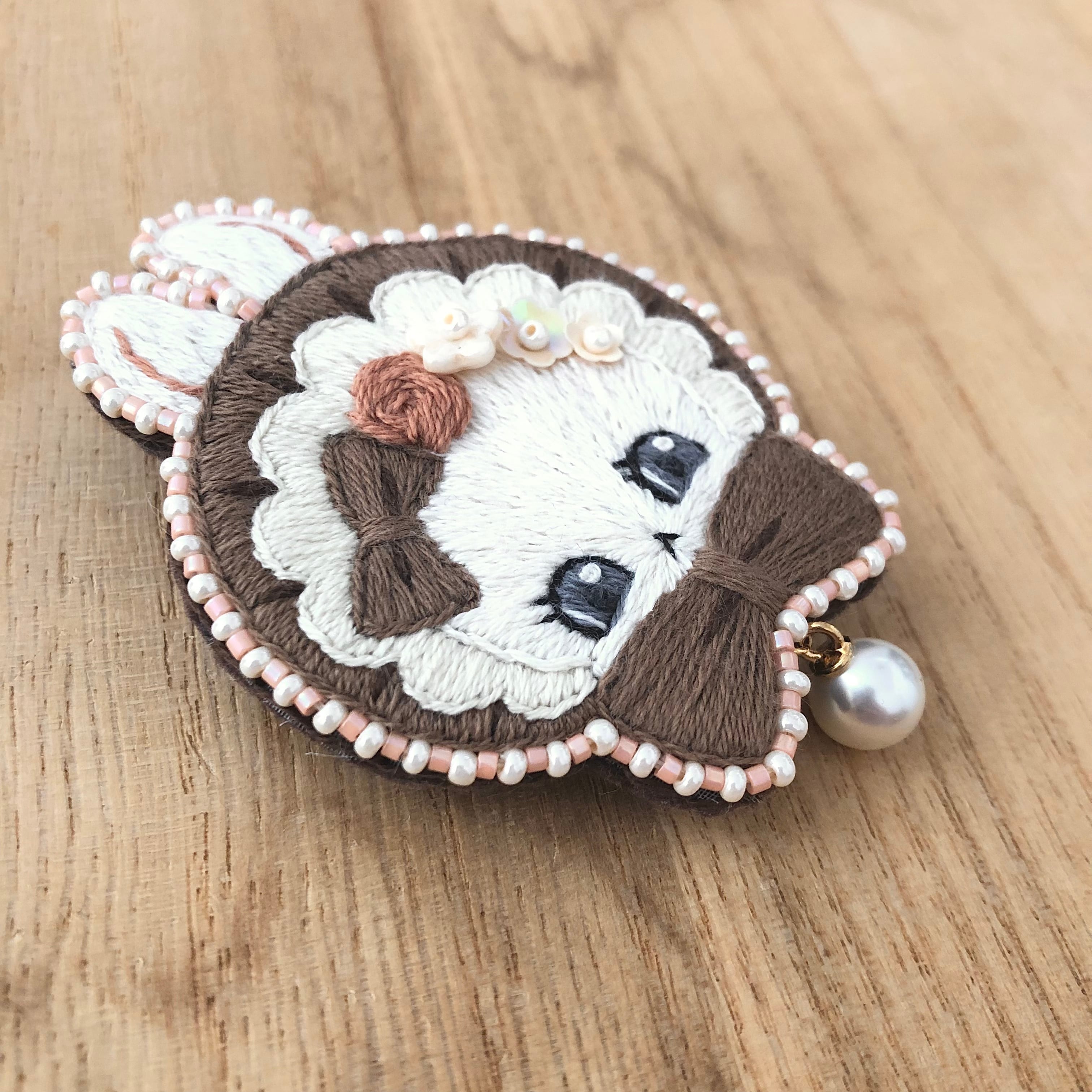 クラシカルなボンネットをかぶったウサギのブローチです。
