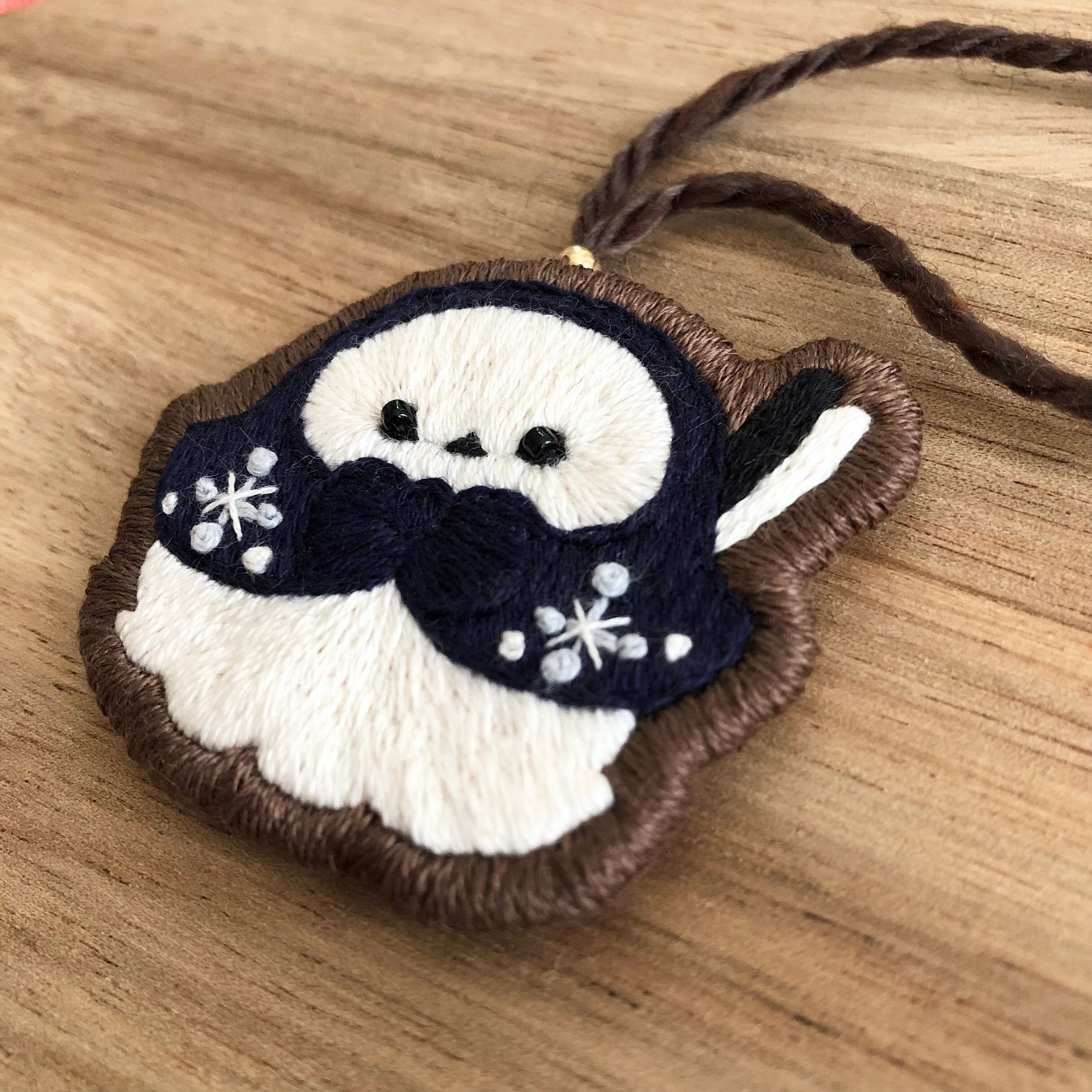 シマエナガの刺繍オーナメント(濃紺×雪の結晶スカーフ)