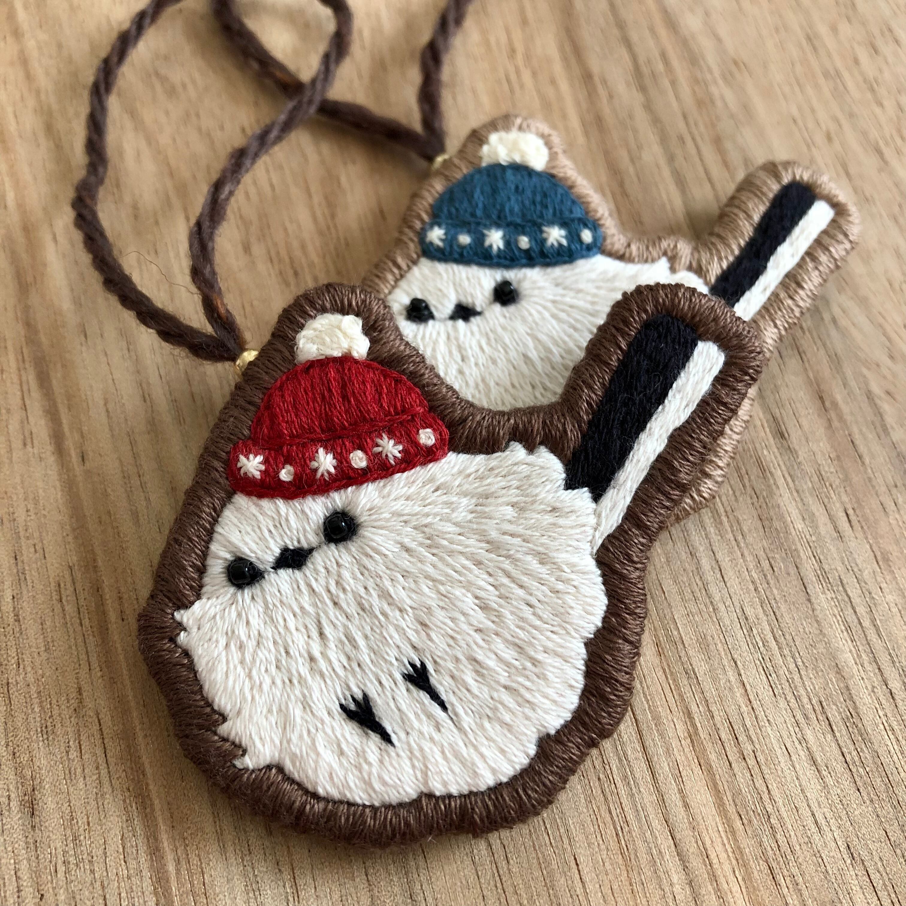 シマエナガの刺繍オーナメント(ぽんぽん付き毛糸帽子・青)