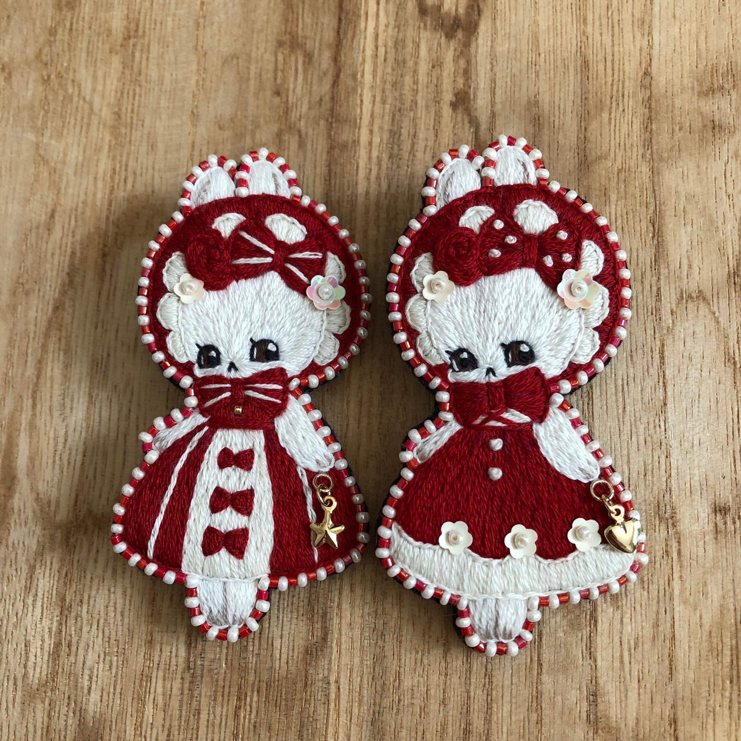 赤×白のロリータドレスを着たうさぎのブローチです。