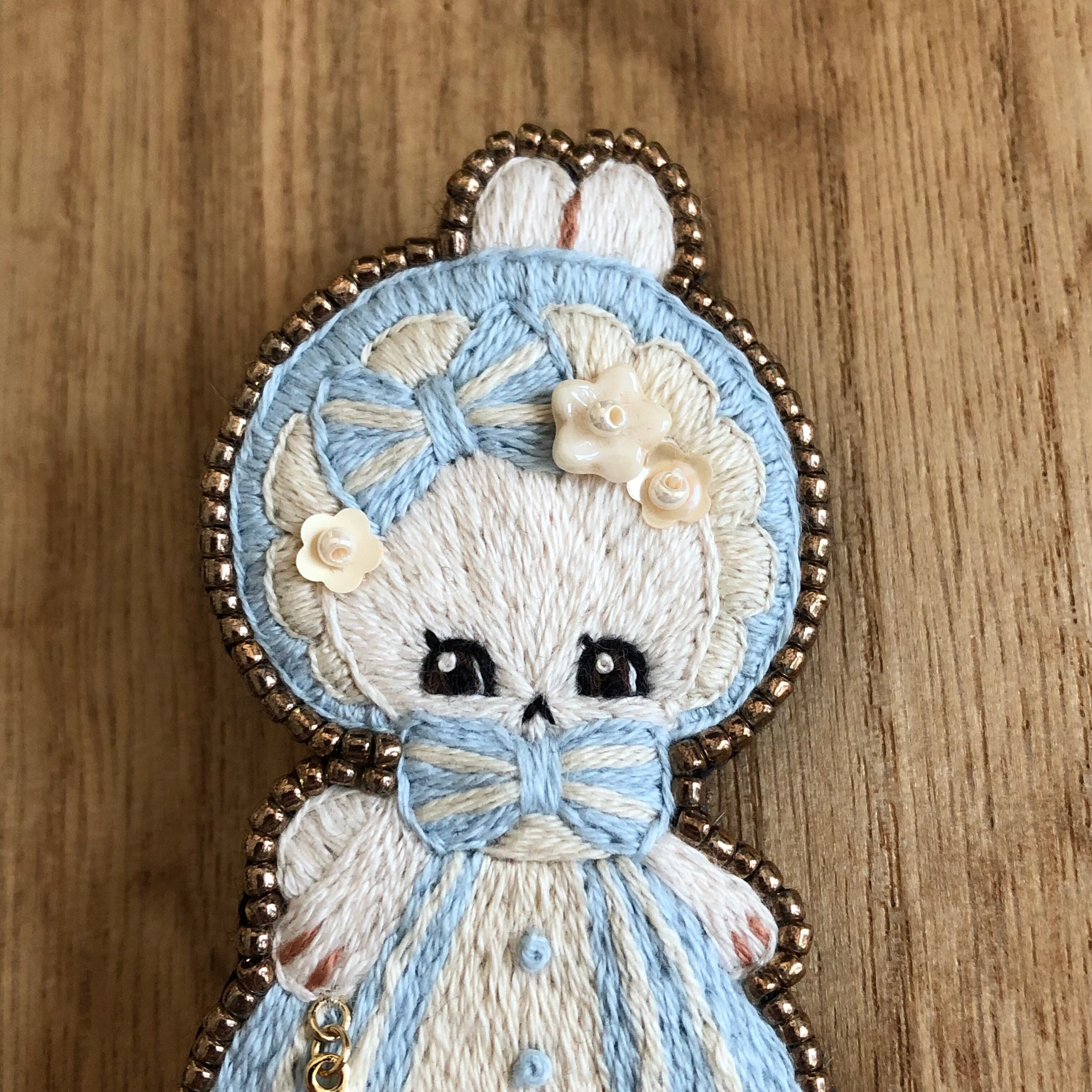 ロリータうさぎブローチ(サックス×生成り)