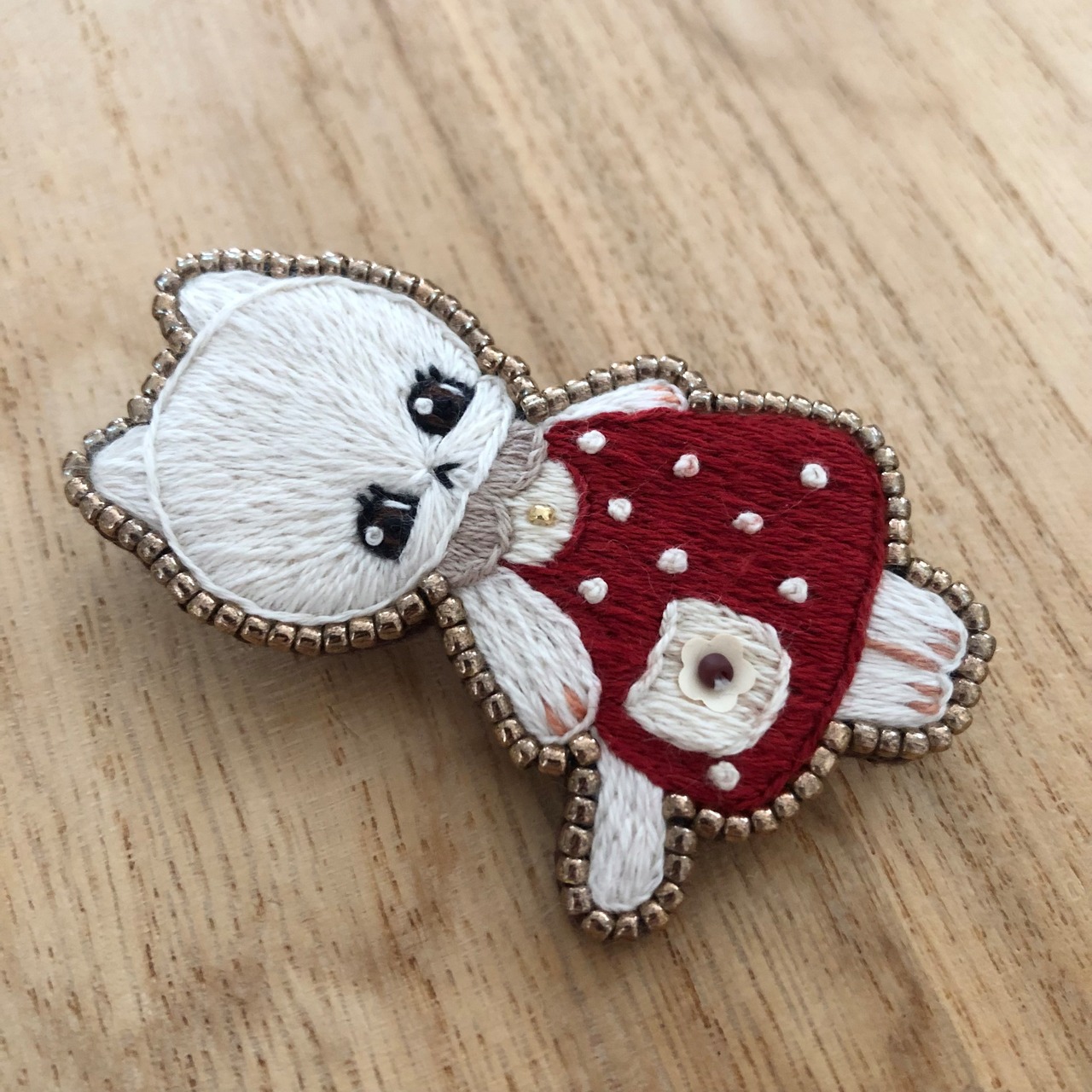 赤色のドット柄ワンピースを着た猫のブローチです。